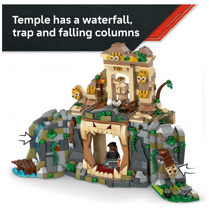 O cenário principal é um templo antigo com colunas que desabam, entrada em formato de cachoeira móvel e armadilha com machados que caem acionados por corrente, criando situações de ação para os dinossauros e minifiguras. Acompanha também helicóptero, caminhão e ninho de dinossauro com ovos, além de acessórios de pesquisa para missões de exploração.?