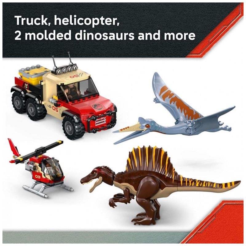 Conjunto LEGO Jurassic World Spinosaurus & Quetzalcoatlus Air Mission 76976 desenvolvido para crianças a partir de 8 anos, com foco em montagem e brincadeiras de exploração em cenário inspirado em Jurassic World Rebirth. O set inclui duas figuras de dinossauros para montar: um Spinosaurus com pernas, braços, cauda, cabeça e mandíbula articuladas, e um Quetzalcoatlus com asas articuladas e mandíbula móvel.?