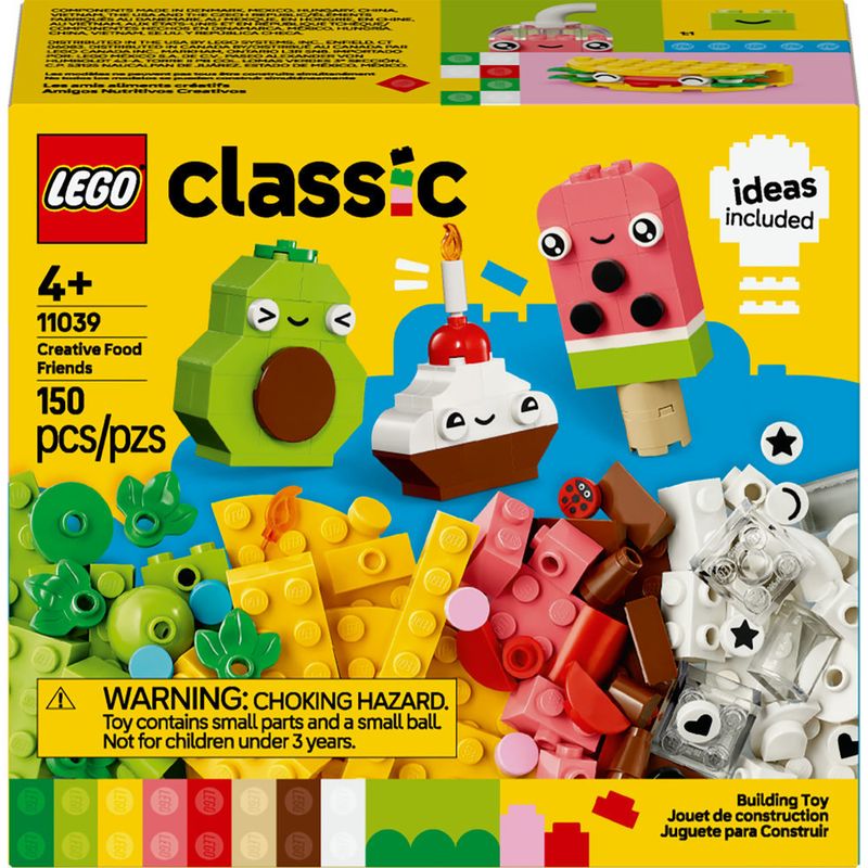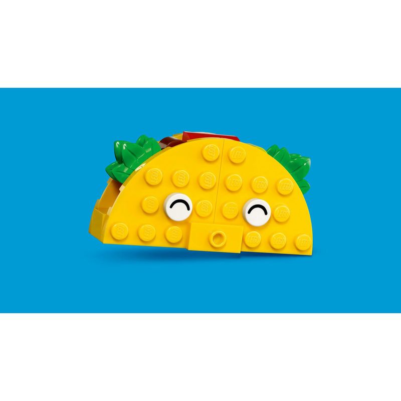 As crianças usam uma variedade de peças para montar especiais coloridas e cativantes, como olhos, bocas e vários elementos decorativos, para construir 4 Amigos da Comida adoráveis: um cupcake, sorvete, abacate e taco. A diversão criativa continua enquanto as crianças misturam as peças para reconstruir os modelos em um bolo com granulado, chá de bolhas, pera e um panini. Conforme as crianças se tornam mais confiantes em suas habilidades de construção, elas podem seguir o guia de construção intuitivo para mudar expressões, formas ou cores para criar novos Amigos da Comida, incluindo um sorvete verde, caixa de suco, fatia de melancia, barra de chocolate e um mega sanduíche.