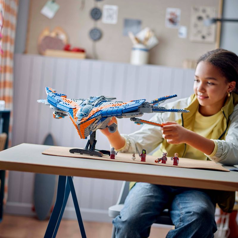 Baseado na nave estelar do primeiro filme Guardiões da Galáxia, este brinquedo montável possui 6 asas ajustáveis ??e 4 propulsores traseiros móveis. A parte superior do modelo da nave espacial levanta para revelar um interior detalhado com 3 áreas distintas: um convés de voo com espaço para 3 minifiguras, uma área comum com um assento adicional e espaço de armazenamento para armas e uma área de descanso com uma cama e um toca-fitas (um elemento-chave nos filmes). Há minifiguras do Senhor das Estrelas, Gamora, Drax e Rocket, além de uma figura do Bebê Groot. Um suporte permite que a nave espacial seja exibida. O aplicativo LEGO Builder permite que as crianças ampliem e girem modelos em 3D usando seu dispositivo digital.