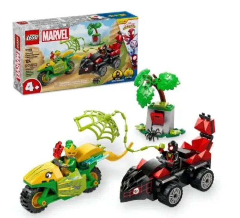 O conjunto recria a ação da temporada 'Dino-Webs' do programa de TV Spidey And His Amazing Friends. Inclui 2 minifiguras de super-heróis e 2 veículos dinossauros de empurrar: Miles "Spin" Morales em um carro de estegossauro e Electro em uma motocicleta de dilofossauro. Um grande elemento de teia, um cristal escondido dentro de uma rocha, além de acessórios de paisagismo inspiram a dramatização criativa das crianças. Dentro da caixa, cada bolsa contém tijolos e um grande tijolo inicial para um modelo e personagem rápidos de construir, para que a brincadeira comece rapidamente. Instruções intuitivas são fornecidas na forma de um guia de história com imagens coloridas.