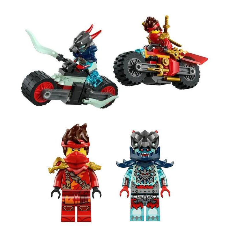 O conjunto Corrida de Motocicleta Veloz do Kai (71838) com 79 peças, permite que meninos e meninas maiores de 6 anos recriem cenas velozes da temporada 3 da série de TV Ninjago Ascensão dos Dragões. O conjunto de batalha de motocicletas inclui duas motos ninja com rodas móveis: a moto de corrida do Kai com duas adagas e a motocicleta demoníaca do maligno Escoteiro Dragão Espectral. O conjunto de veículos ninja inclui duas minifiguras Ninjago para pilotar as motos: o Kai armado com uma lâmina translúcido e duas catanas douradas e um Escoteiro Dragão Espectral com uma espada. Assim, as crianças podem viver brincadeiras imaginativas por conta própria ou com seus amigos, encenando batalhas de bem contra o mal. A linha de conjuntos e brinquedos ninja LEGO Ninjago construíveis para crianças inclui dragões, veículos e templos para que fãs possam viver aventuras com seus heróis. Cada conjunto ninja pode ser criado com o aplicativo LEGO Builder, que guia você e seu filho em uma aventura de construção fácil e intuitiva.
