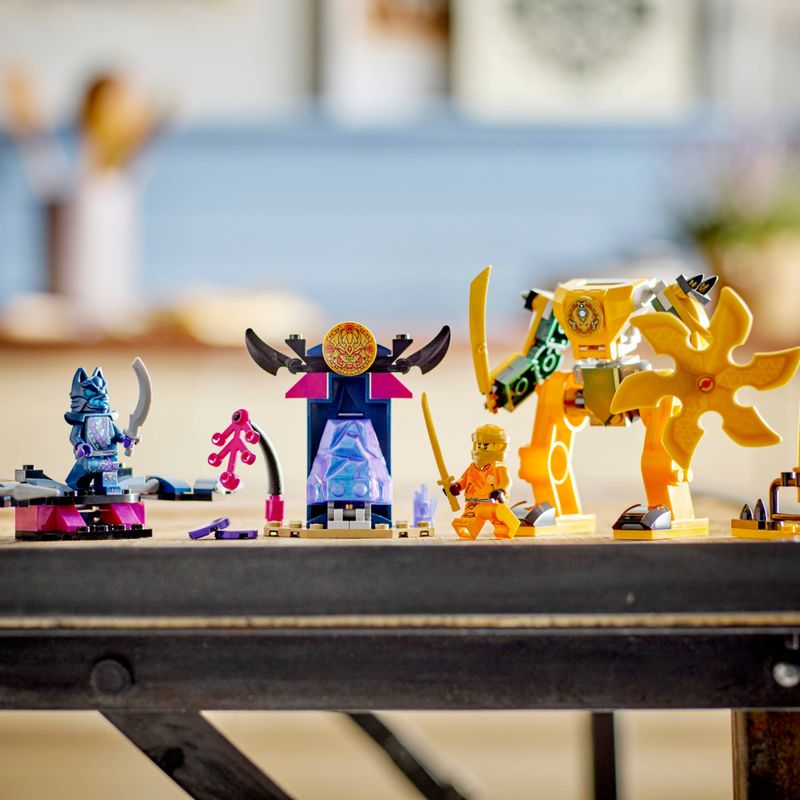 2 minifiguras LEGO® NINJAGO® – O conjunto Ninja inclui uma minifigura de Arin armada com um acessório de katana para que as crianças possam encenar a ação contra o Guerreiro Máscara de Lobo com sua espada