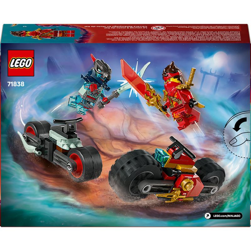 O conjunto Corrida de Motocicleta Veloz do Kai (71838) permite que meninos e meninas maiores de 6 anos recriem cenas velozes da temporada 3 da série de TV NINJAGO Ascensão dos Dragões. O conjunto de batalha de motocicletas inclui duas motos ninja com rodas móveis: a moto de corrida do Kai com duas adagas e a motocicleta demoníaca do maligno Escoteiro Dragão Espectral.
