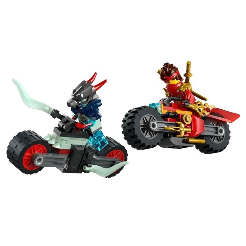 O set com veículos ninja inclui 2 minifiguras NINJAGO para usar com as motas: Kai, armado com uma lâmina de revelação translúcida e 2 catanas douradas, e um Batedor Draconiano Espectral, com espada. As crianças vão desfrutar de brincadeiras imaginativas sozinhas ou com amigos enquanto encenam batalhas do bem contra o mal.