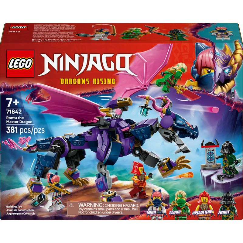 O brinquedo LEGO NINJAGO Rontu, o Mestre Dragão (71842) permite que fãs de ninjas a partir de 7 anos recriem cenas cheias de ação da 3ª temporada da série de TV NINJAGO: A Ascensão dos Dragões. Este conjunto de construção para crianças inclui um dragão de brinquedo com cauda, ??pernas, asas, cabeça e mandíbula ajustáveis, 2 posições para colocar uma minifigura nas costas e um disparador de espigas sob cada asa.