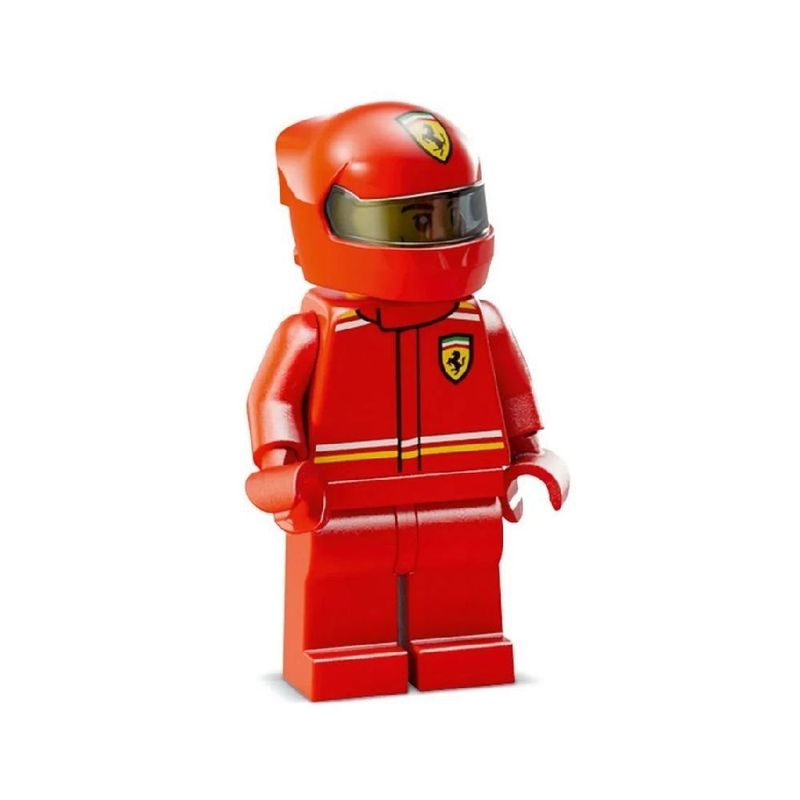 O carro de F1 inclui um cockpit que abre levantando o halo, uma asa traseira, suspensão triangular, autocolantes de patrocinadores e pneus traseiros mai s largos com estampado «Pirelli». O carro de F1 também inclui uma minifigura de piloto com fato da Ferrari e capacete para colocar no cockpit e competir em corridas.