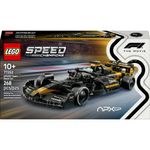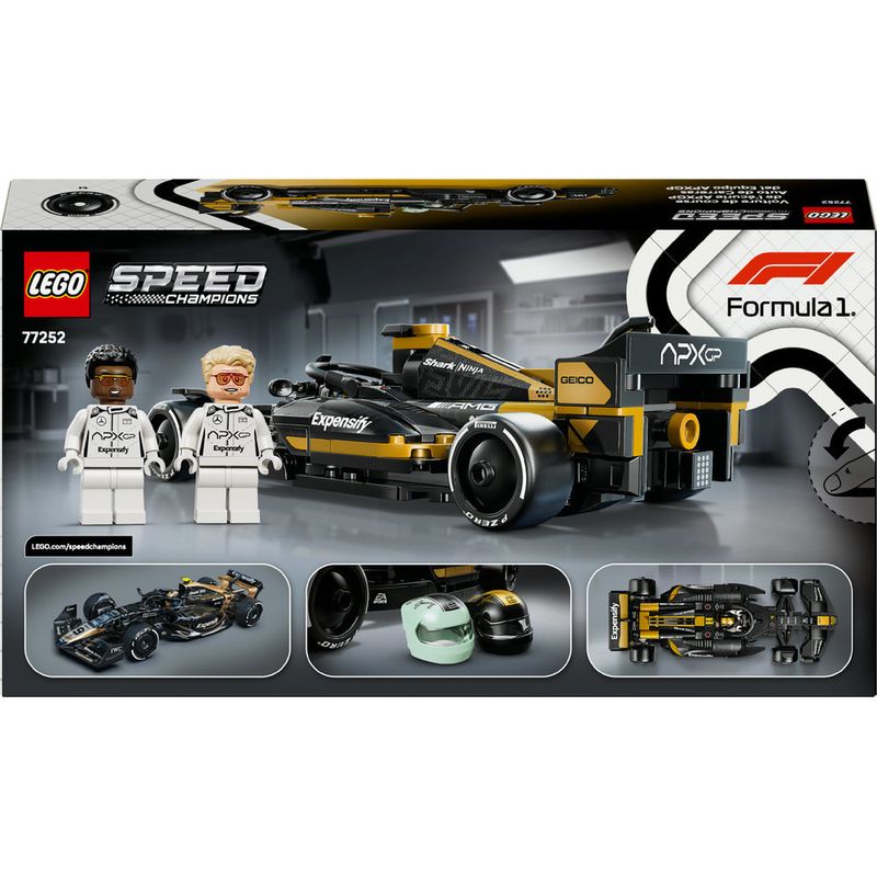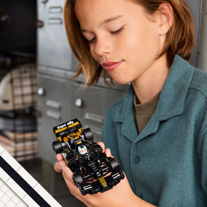 Este carro de F1 inclui detalhes do carro do filme, incluindo sua pintura em preto e dourado, adesivos de patrocinadores e pneus traseiros largos impressos com “Pirelli”. O conjunto de carro de corrida também inclui duas mini figuras de pilotos de F1 do filme: Sonny Hayes e Joshua Pearce, cada um com seu próprio capacete que inclui suas assinaturas, uma peruca e uma chave inglesa, que também pode ser usada para aplicar adesivos e separar peças.