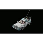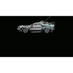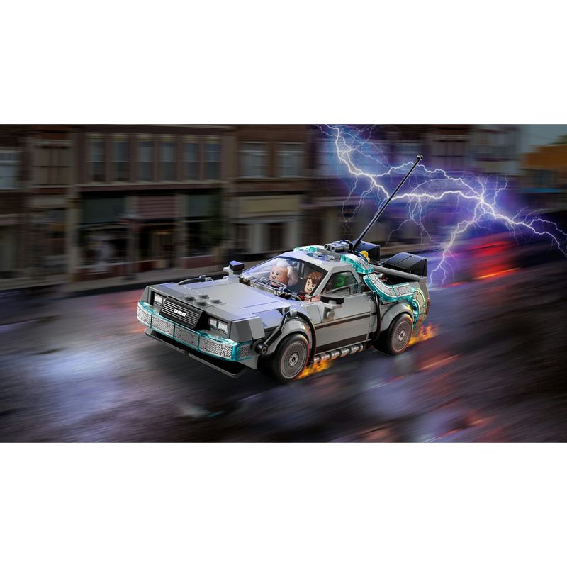 Construa este carro icônico com um para-raios e placa da Califórnia do primeiro filme antes de reconstruí-lo em sua versão voadora do segundo filme com o Sr. Fusão, uma placa laranja e rodas deitadas. Ambas as versões têm saídas de ar traseiras, um cockpit, o condensador de fluxo e a calculadora temporal.