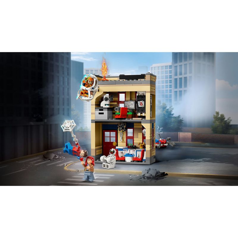 O conjunto para construir contém quatro minifiguras: O Duende Macabro em seu planador com bombas de abóbora; o Homem-Aranha e Anti-Venom que disparam teias; e a Mary Jane com um robô-aranha articulado. Uma teia gigante e flexível presa ao edifício captura uma minifigura. Há uma cozinha no primeiro andar do apartamento. O andar de cima tem um escritório e quarto com uma cama que dobra, mesa, computador, câmera e microscópio. Uma função ativada por botão causa o colapso de parte do edifício. As crianças podem conectar este conjunto para construir e brincar ao Homem-Aranha vs. Oscorp (76324) e empilhá-lo em cima do Aranhaverso: Miles Morales vs. Spot (76311) para uma experiência lúdica ainda maior. Contém 394 peças.