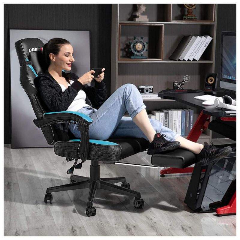 Cadeira de computador de segurança e conforto Elevador a gás classe 3, durável, confiável e suporta até 181 kg. Alta capacidade de carga de base de 5 estrelas. Rodízios de borracha, rolando silenciosamente e testados por 1000 milhas rolando. Esta é uma cadeira gamer para adolescentes adultos e crianças.