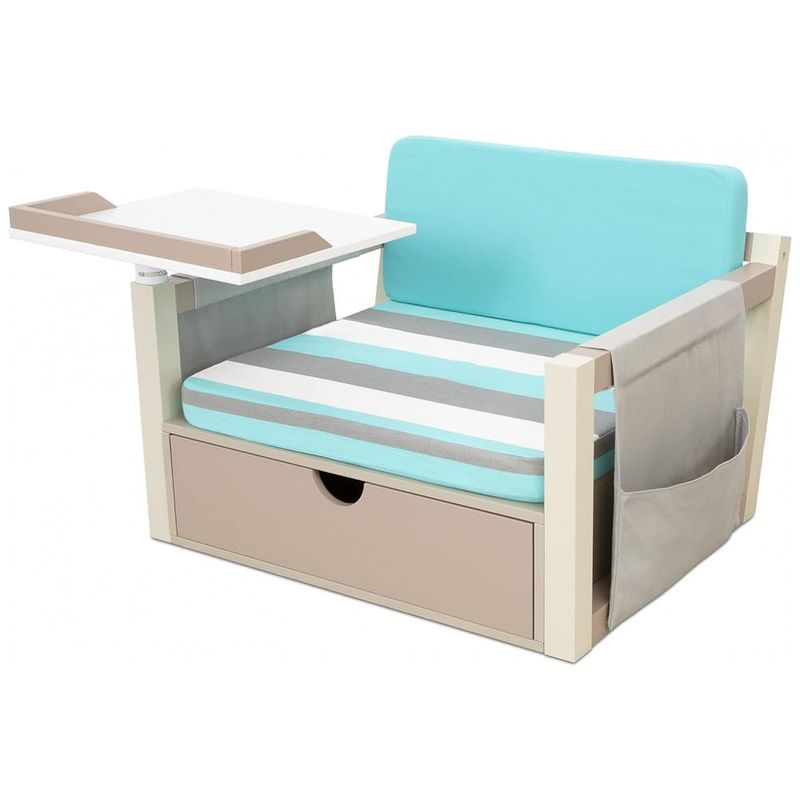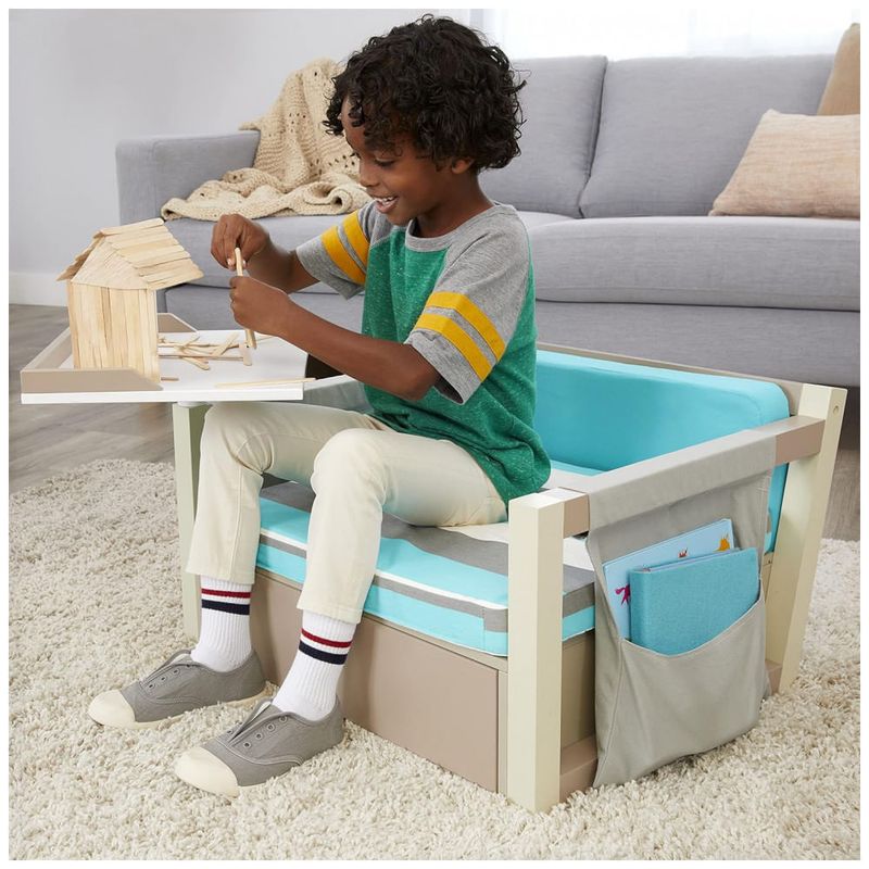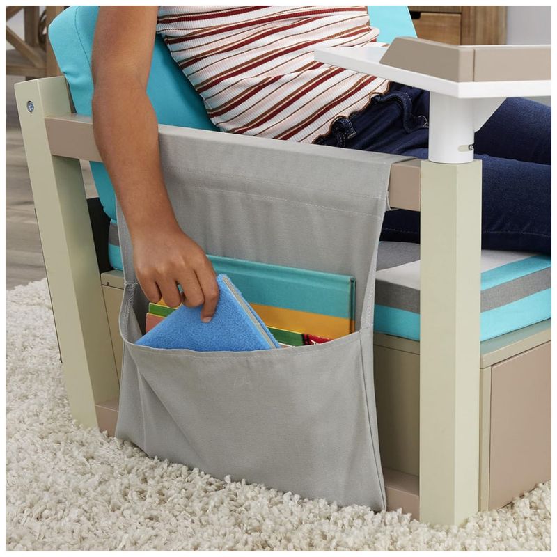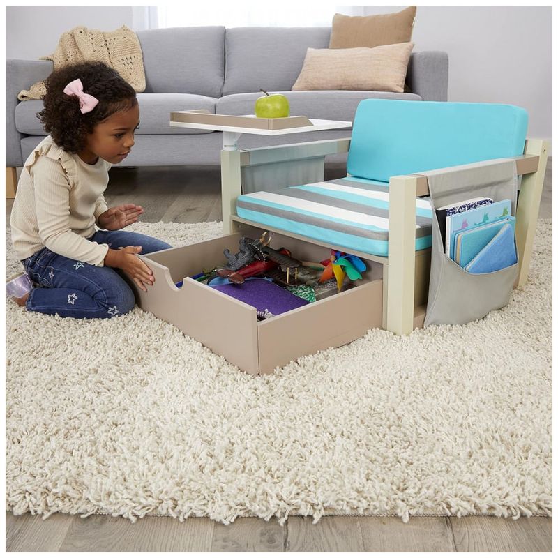 ASSENTO CONFORTÁVEL A mesa giratória 2 em 1 Fun Study de madeira real é uma poltrona ampla com almofada de tecido confortável.