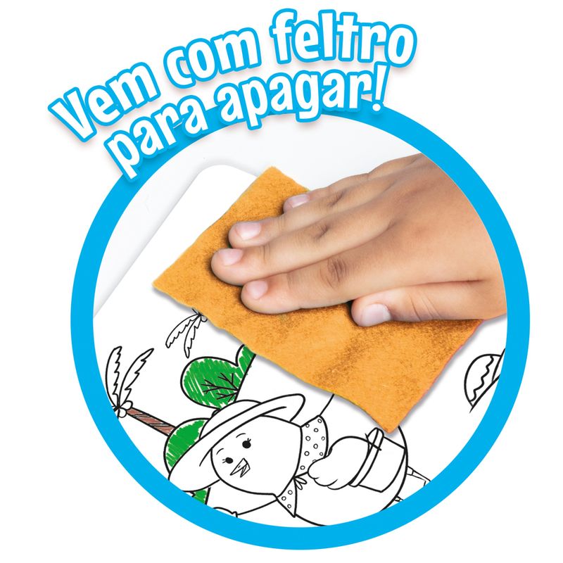 O produto acompanha 4 cores de giz de cera e um apagador para os pequenos pintar e colorir diversas vezes a historinha de Férias na Praia.