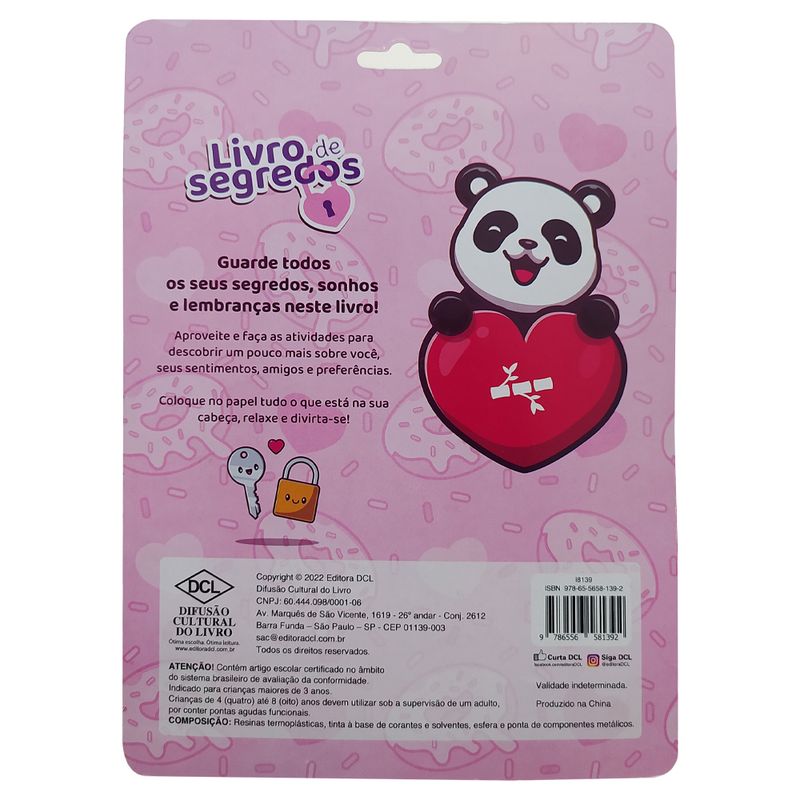 Acompanha 1 livro 12,4 x 17,7 cm, cadeado com 2 chaves, caneta Pompom e Adesivos.