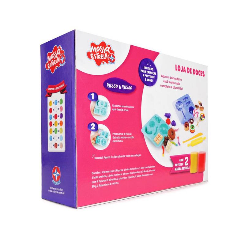 A Loja de Doces com Massa Estrela conta com dois potes de massa de 50g e duas formas com moldes de pirulito, balas, chocolate, gelatinas, donuts, churros e bolinho.