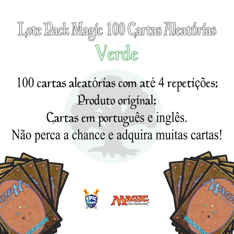 Ao adquirir o nosso lote você vai levar 100 cartas aleatórias em português e inglês, nas dimensões 63,5mm X 88mm, todas as cartas pertencem à cor Verde e não pode ser alterado.