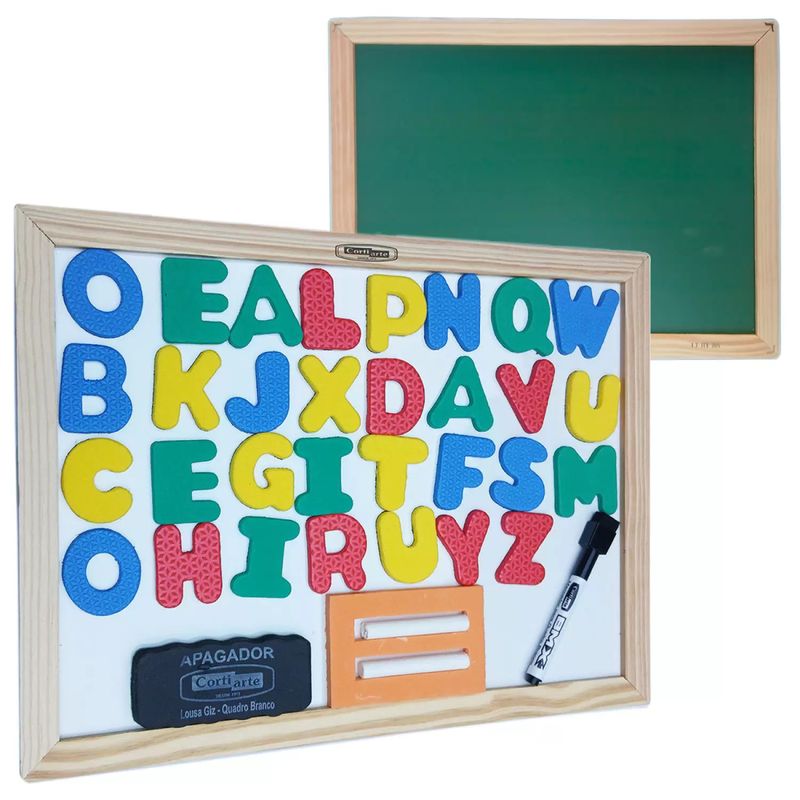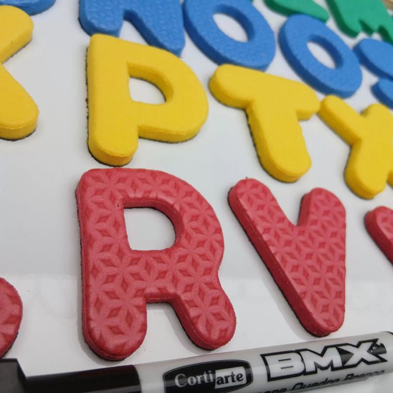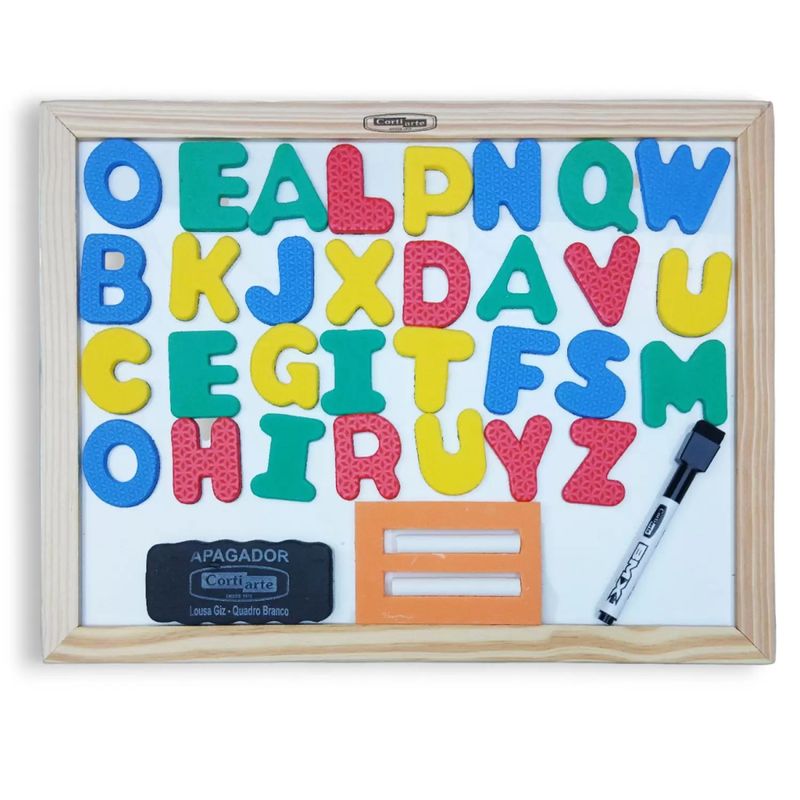 Acompanha 31 letras em EVA, apagador, caneta para quadro branco e giz.