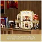 Conjunto combinado de blocos de montar em plástico composto por um banco western de grande porte e um acampamento de bandidos em floresta de sequoias, formando um cenário completo de assalto e fuga no Velho Oeste. O banco apresenta fachada em “pedra”, interior com salão principal, área administrativa e cofre detalhado com barras de ouro e cédulas impressas, enquanto o outpost reúne árvore gigante, terreno rochoso, caverna e área de acampamento de fora da lei.?