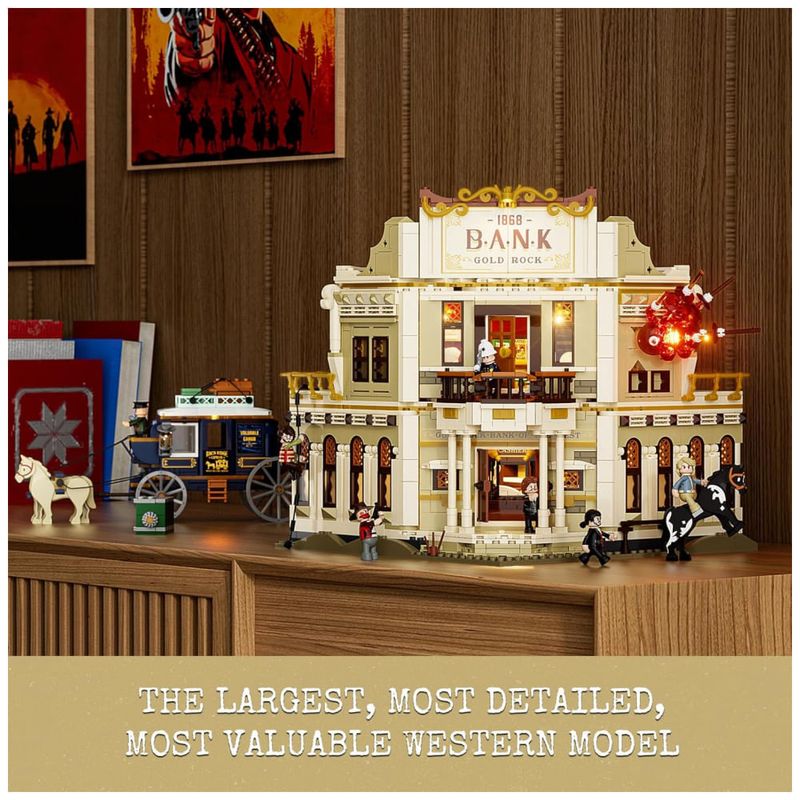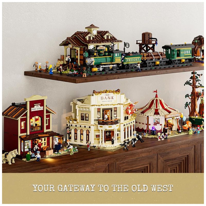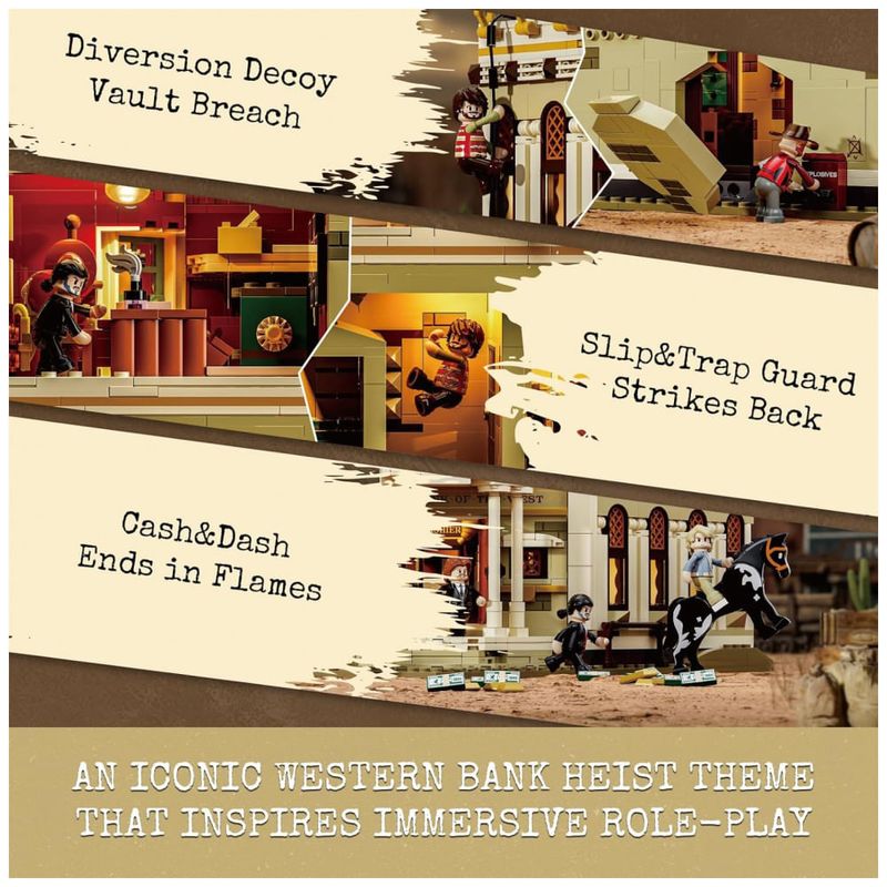 Os dois modelos compartilham narrativa com personagens recorrentes, como líder de bando, procurado em cartazes no banco e figura de ave de rapina associada ao esconderijo, permitindo construir uma história contínua de roubo de ouro e perseguição até o acampamento. O conjunto é voltado para colecionadores e fãs de cenários western, com alta contagem de peças, foco em exibição e compatibilidade com outros itens da linha Lumibricks Western.?