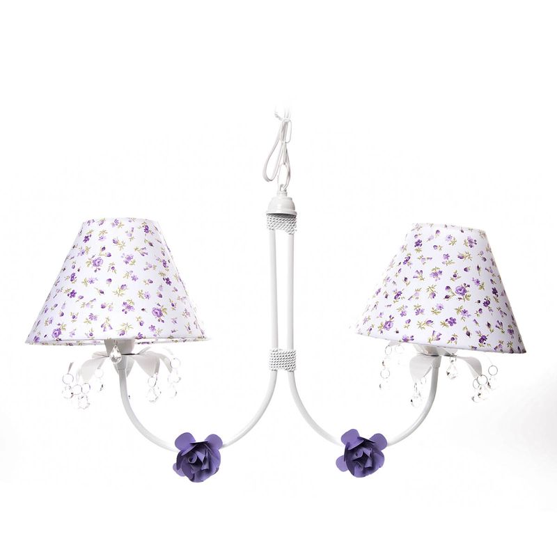 Lustre de 2 lâmpadas em alumínio com pintura eletrostática branca, cúpulas em acetato forrado com tecido, 2 florzinhas de metal lilás e decoração com gotas de acrílico.