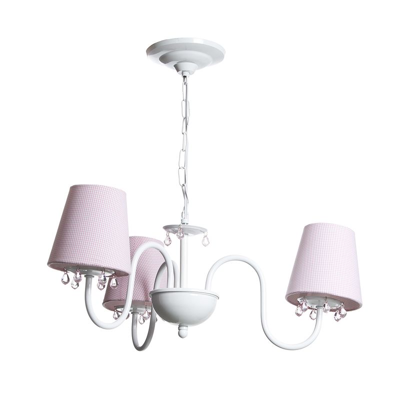 Lustre de 3 lâmpadas em alumínio com pintura eletrostática branca, decoração com pingentes de acrílico rosa e cúpulas em acetato forrado com tecido.