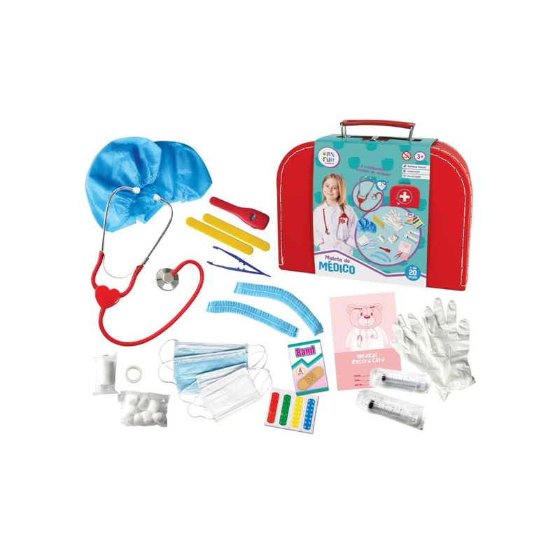 Com a Maleta do Médico da Fanfun a brincadeira fica ainda mais real! Faça descobertas e cuide dos seus amigos e da sua família. Coloque as luvas, as máscaras para higiene. Use o estetoscópio para checar os batimentos e medique com muito amor.