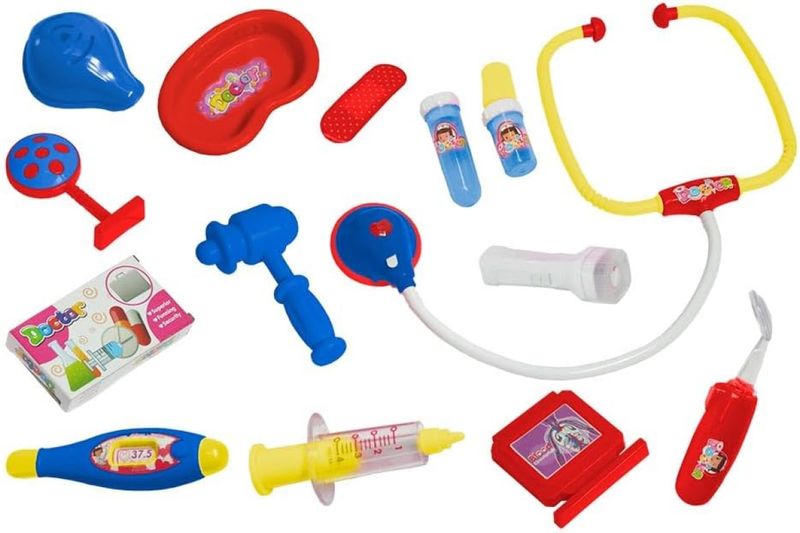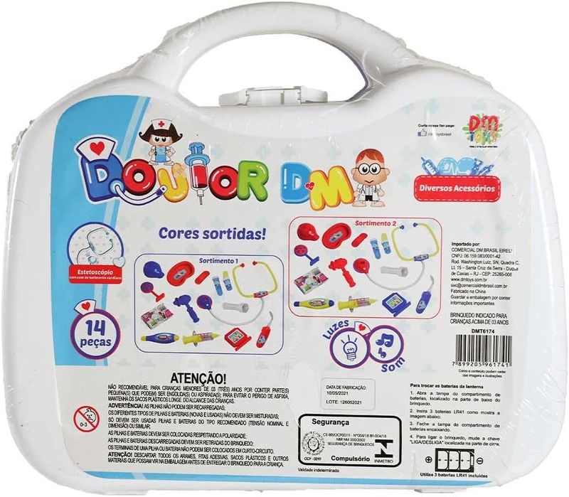 Acessórios com luzes e som! São 14 peças que vem guardado em uma linda maleta que ajuda a criança levar a brincadeira para onde desejar e deixar todas as peças organizadas em um só lugar. O estetoscópio tem som de batimento cardíaco.