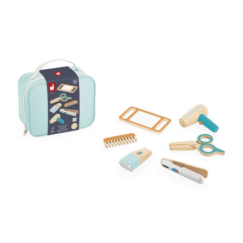 Pronto para um novo corte de cabelo? Com este conjunto completo de cabeleireiro, o seu filho vai fazer maravilhas pelo seu estilo! Na sua pequena mala de tecido transportável, ele terá tudo o que precisa para praticar os seus conhecimentos de cabeleireiro ou barbeiro: um pente, um secador de cabelo, uma máquina de cortar, uma tesoura, um alisador e o espelho indispensável para partilhar o seu trabalho com o cliente do dia! Todos estes acessórios são fabricados em madeira FSC (madeira proveniente de florestas geridas de forma sustentável) e exibem a sua cor natural. Também somos loucos pelo design meticuloso e pelas cores deste pequeno kit de cabeleireiro perfeito, em tons de azul/laranja (tinta à base de água) para combinar com o kit azul-celeste. Todos os acessórios cabem perfeitamente no estojo, que se fecha com um fecho de correr. Vamos passar horas a fio a sonhar com os penteados mais loucos e a partilhá-los com os amigos e a família! Para crianças a partir dos 3 anos. Dimensões 21,6 x 9,5 x 16,5 cm Material Madeira (bétula), tecido Tipo de embalagem Estojo com fecho de correr e pegas em tecido para facilitar o transporte