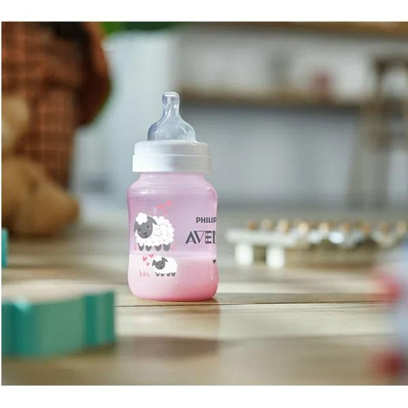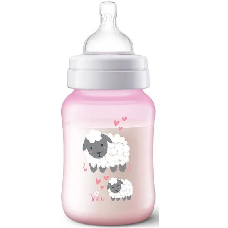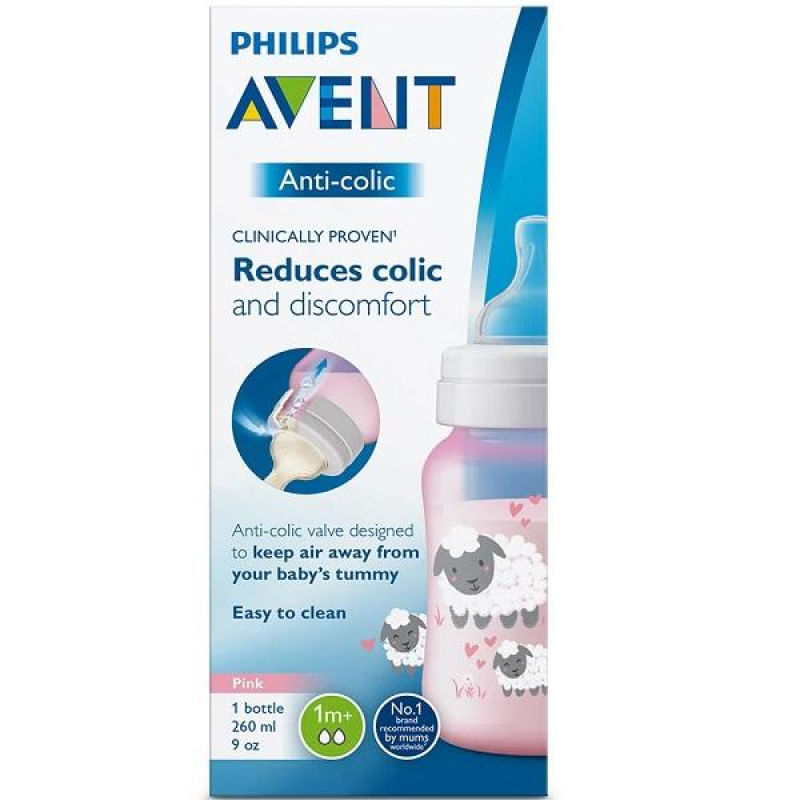A válvula anticólica foi projetada para reduzir cólicas e desconforto. Conforme o bebê mama, a válvula integrada ao bico se dobra, permitindo que o ar entre na mamadeira, evitando a formação de vácuo e movendo o ar para a parte de trás da mamadeira.