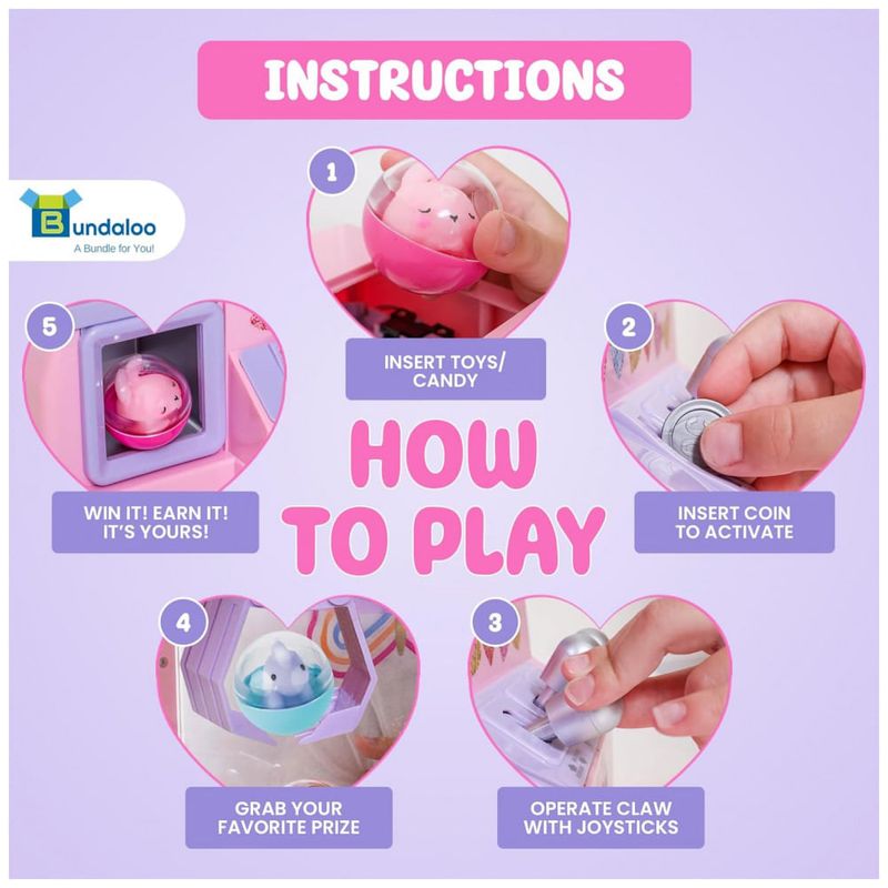 Itens inclusos: 3 brinquedos macios surpresa, 3 cápsulas plásticas reutilizáveis, 30 fichas reutilizáveis, máquina de garra