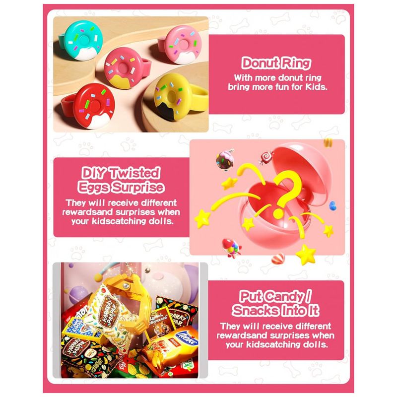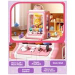 Conteúdo do kit: 1 máquina de garra, 35 mini brinquedos (pelúcias, ovos surpresa e acessórios), moedas de jogo