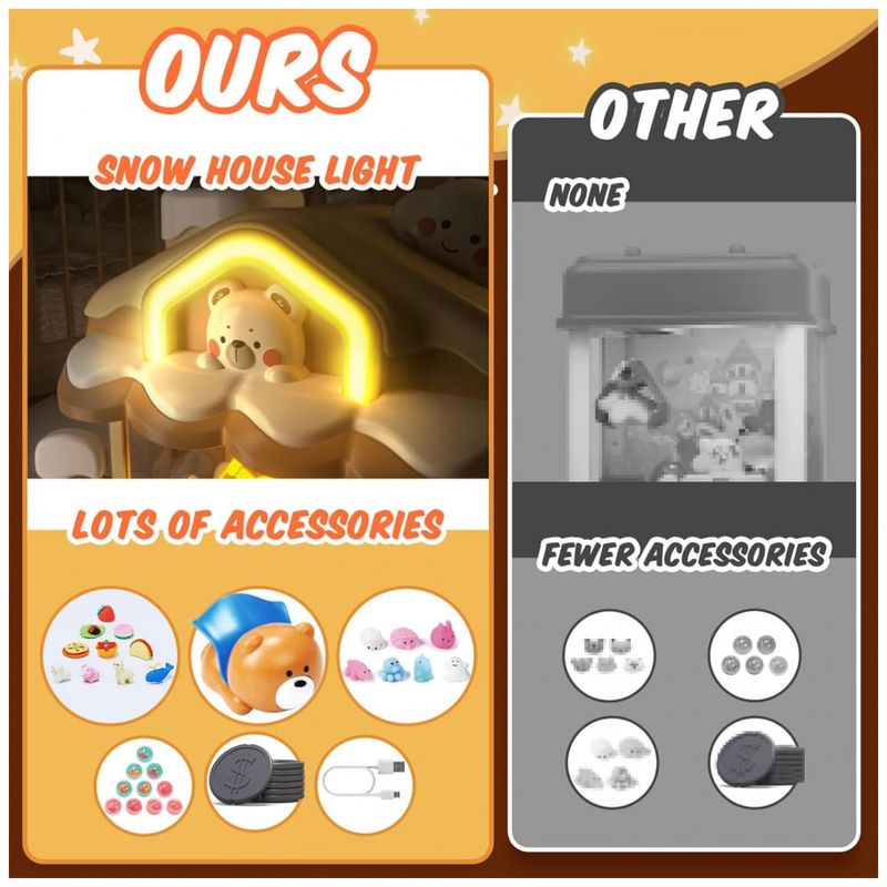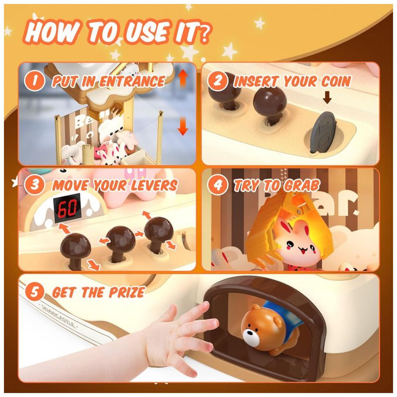 Conteúdo do pacote: 1 máquina de garra, 1 ursinho de pelúcia, 10 ovos surpresa, 10 borrachas, 7 brinquedos macios, 25 moedas, cabo USB