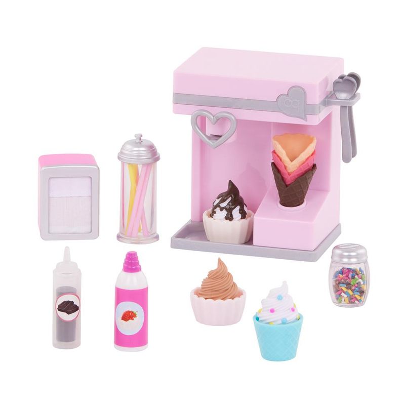 Sirva diversão com o conjunto Our Generation Sundae Fun Day! Esta máquina de sorvete tem tudo o que os amantes de sorvete precisam para criar delícias em miniatura. As crianças podem ativar a alavanca para ouvir sons divertidos enquanto preparam sobremesas imaginárias. Com 3 sorvetes de brinquedo para encher cones e tigelas de waffle, além de acessórios como um pote de canudos e um porta guardanapos. Adicione toques finais com os confeitos, frascos de chantilly e calda de chocolate.
