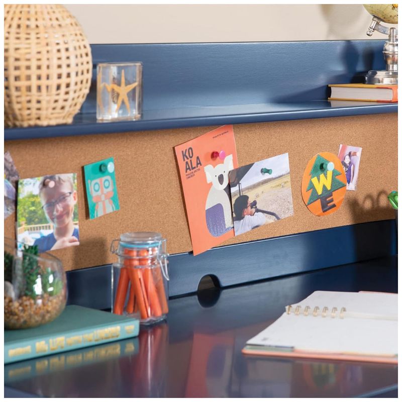 A escrivaninha infantil Martha Stewart Kids’ Desk with Hutch and Chair Set Navy foi desenvolvida como estação de estudo e criação para crianças, combinando mesa com tampo retangular, hutch superior com nichos e quadro de cortiça, além de cadeira coordenada. A peça utiliza estrutura em madeira de bétula e madeira engenheirada com acabamento azul marinho de fácil limpeza e bordas arredondadas, adequada para uso diário em quartos infantis e áreas de estudo.?
