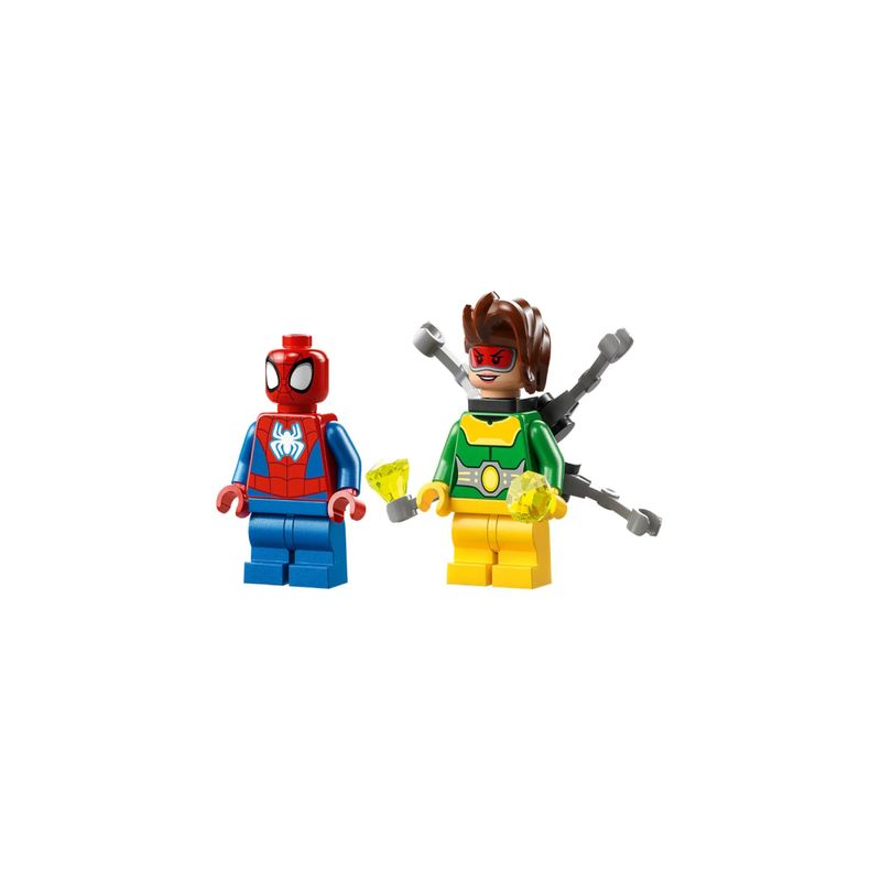 • Personagens icônicos – Inclui as minifiguras do Homem- Aranha e da Doc Ock, além do carro do Homem-Aranha, que contém 2 elementos de teias que brilham no escuro e uma Peça Inicial de chassi para incentivar construtores de primeira viagem