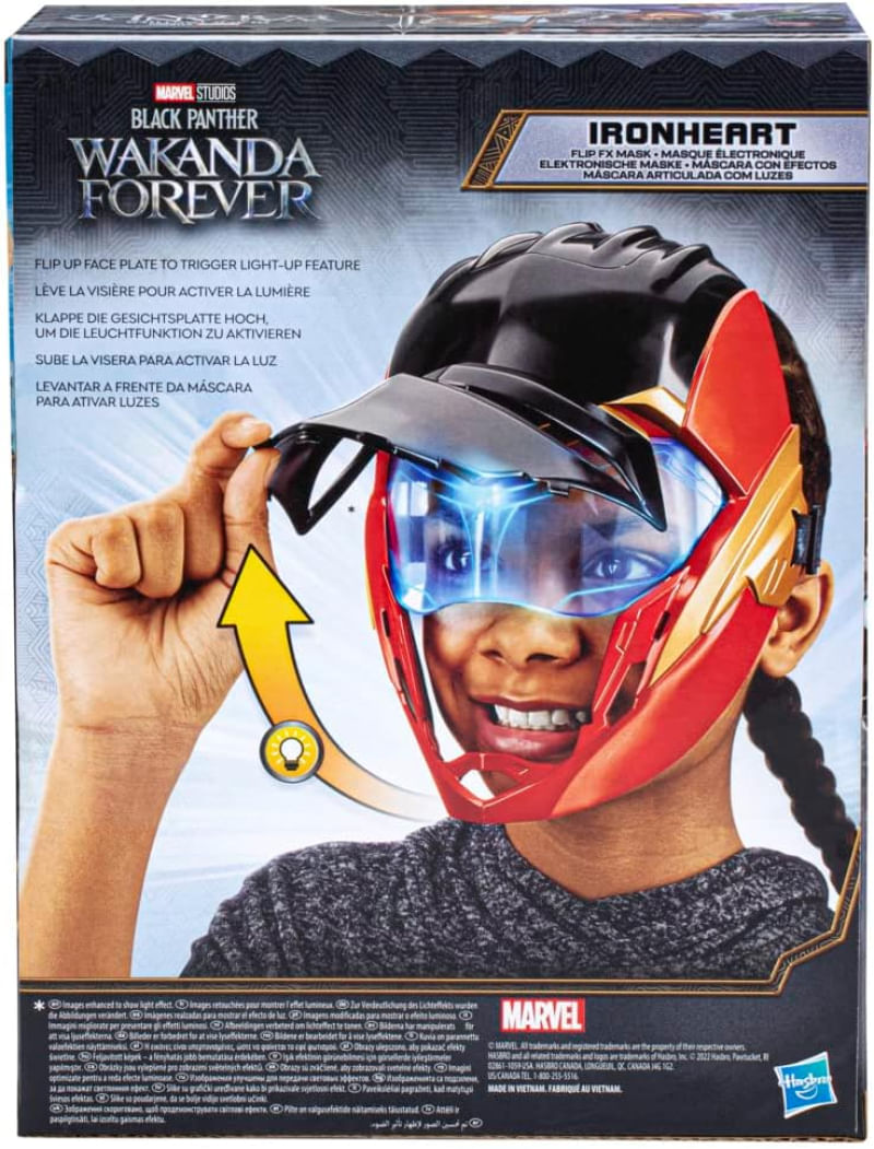 Uma jovem e brilhante estudante do MIT que tem paixão por engenharia, a vida de Riri Williams toma um rumo inesperado quando um projeto escolar traz os wakandianos e um inimigo perigoso à sua porta. As crianças podem se vestir como Ironheart e imaginar ajudar Shuri e outros heróis de Wakanda em sua missão de salvar o mundo contra novos e poderosos inimigos. Esta máscara é inspirada no Black Panther Wakanda Forever da Marvel Studios e apresenta um face retrátil e um recurso de iluminação. Outros brinquedos disponíveis para se vestir como seu super-herói favorito da Marvel. Cada brinquedo vendido separadamente. Sujeito a disponibilidade. Copyright 2022 MARVEL. Hasbro and all related terms are trademarks of Hasbro.