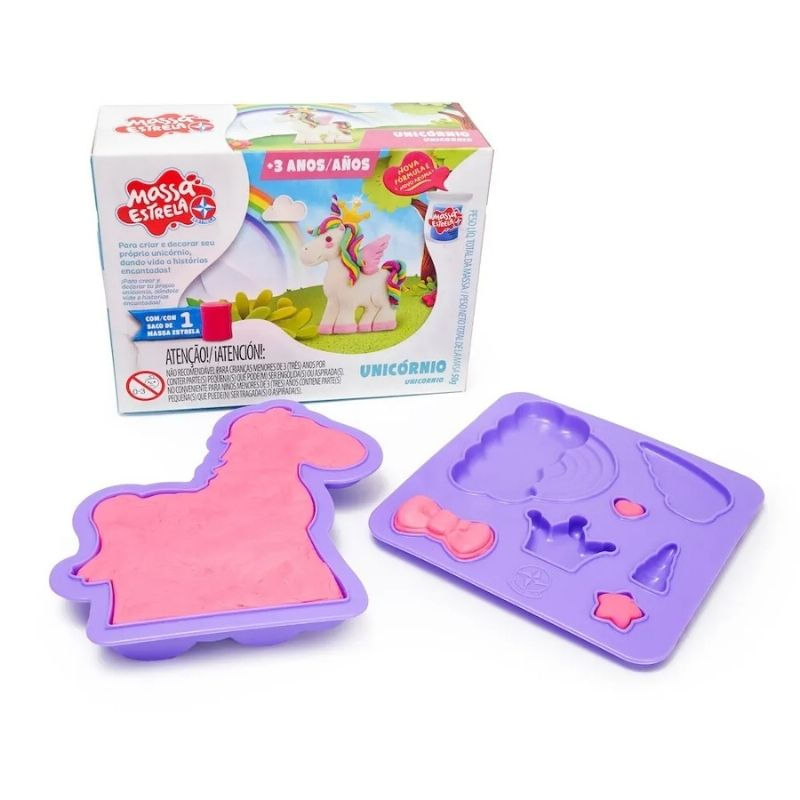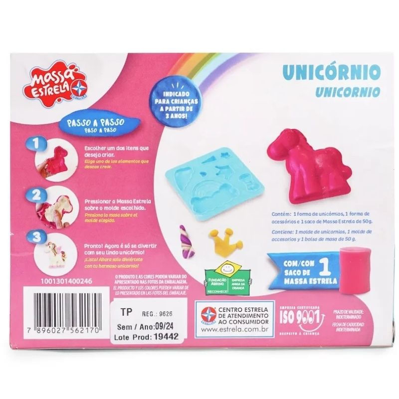 - Conteúdo da Embalagem: Uma forma de unicórnio e uma forma com moldes para decorar. Tem opção de coração, de asas, chifre, nuvem e arco-íris. Acompanha um saco de Massa Estrela 50 gramas.