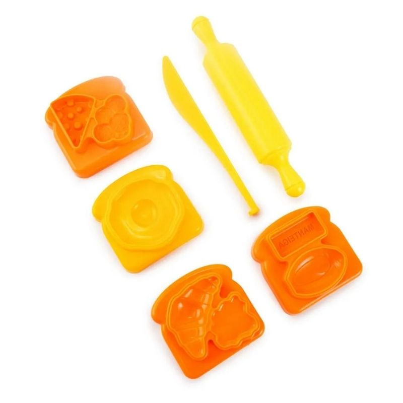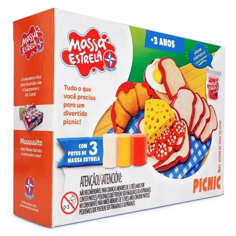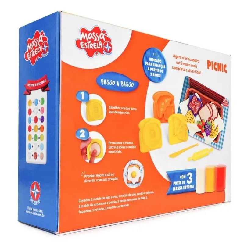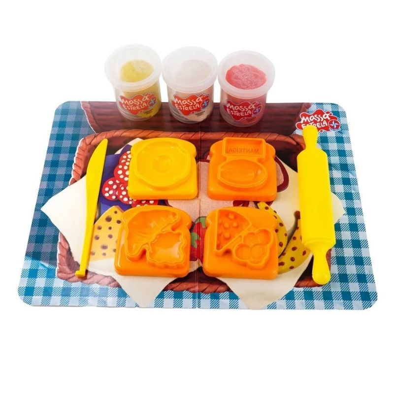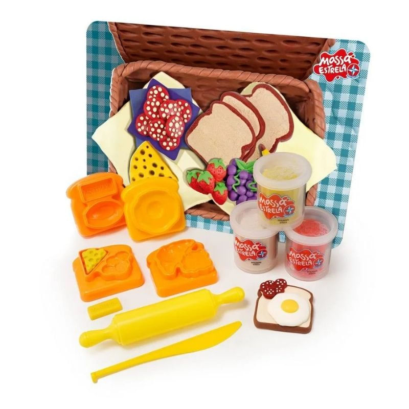 - Conteúdo da Embalagem: 3 moldes (pão e ovo, pão/queijo/salame, croissant/geleia), 3 potes de massa de modelar de 50g, 1 faquinha, 1 rolinho e 1 cenário cartonado (toalhinha e cesta de piquenique).