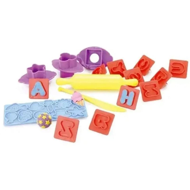 Conteúdo da Embalagem: 01 Livro interativo, 26 formas das letras do alfabeto, 01 forma dupla face com números de 0 a 9, 03 formas dupla face com 02 formatos geométricos cada, 01 faca plastica, 01 rolinho e 04 potes de massinha.