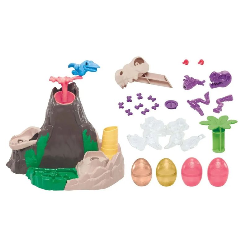 É um vocano slime: a diversão está pronta para entrar em erupção com este brinquedo de dinossauro. Faça de conta o fluxo de lava: encha o crânio T-Rex e gire o pteridáctilo no topo do vulcão para fazer a lava, voar para o vale abaixo, e descubra os ossos de mini dinossauro ao longo do caminho, 4 ovos cada preenchido com 59 ml de composto de geleca Play-Doh brilhante, escorregadio, suave e escorregadio, além de rubis e ossos de mini dinossauro misturados.