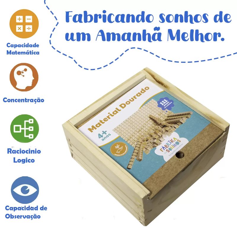 Uso: O material Dourado foi idealizado pela médica e educadora italiana Maria Montessori com o objetivo de auxiliar o ensino e a aprendizagem do sistema de numeração décima-posicional, as operações fundamentais, frações-decimais, medidas, etc.