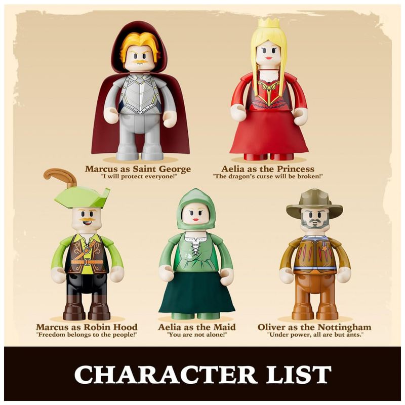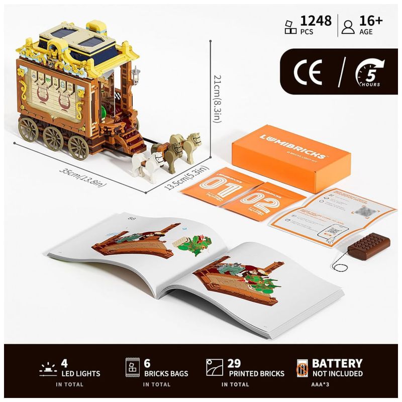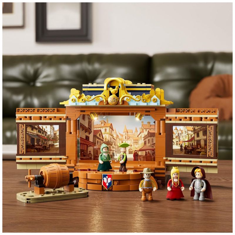 A carroagem reproduz um estilo europeu medieval com paredes laterais articuladas e área de palco destacável, permitindo alternar entre modo de turnê e modo teatro fixo. O conjunto inclui minifiguras, figurinos, expressões intercambiáveis e acessórios de cena, favorecendo a criação de histórias baseadas em temas como cavaleiros, dragões e lendas clássicas.?