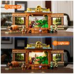 O sistema de iluminação oferece pontos de luz distribuídos, incluindo elementos que simulam lanternas e refletores de palco, ajustando a atmosfera do cenário montado. O produto é indicado para montagem por adolescentes e adultos a partir de 16 anos, com foco em exibição de colecionador e construção detalhada.?