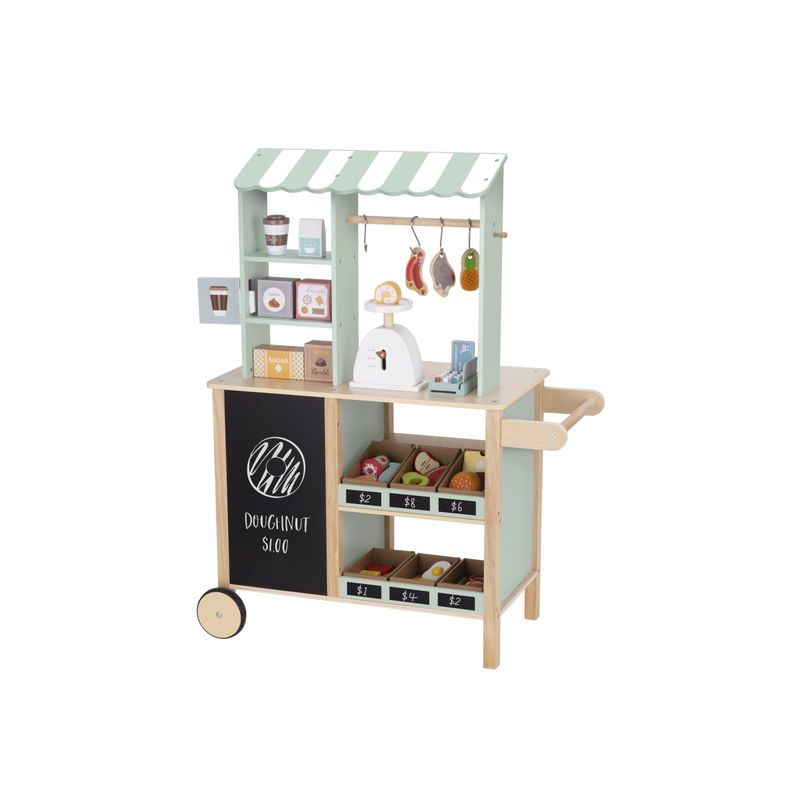 Um quadro preto na frente, onde as crianças podem escrever o nome da loja ou menu.