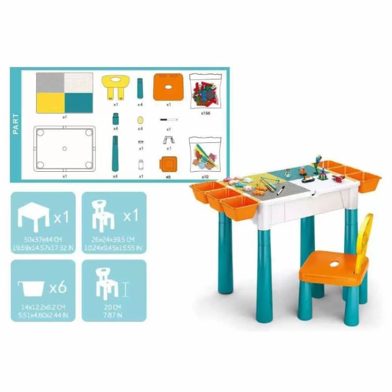 1 mesa com regulagem de altura (requer montagem), 1 cadeira (requer montagem), lousa/base para peças de montar, 6 bandejas para objetos, 166 peças de montar coloridas (incluso adesivos.