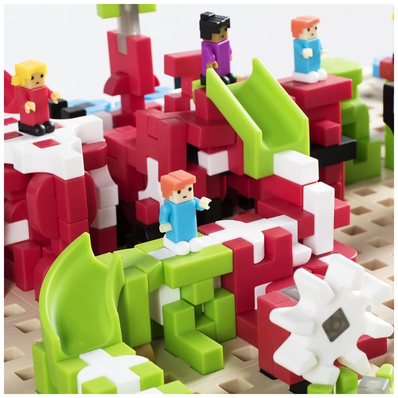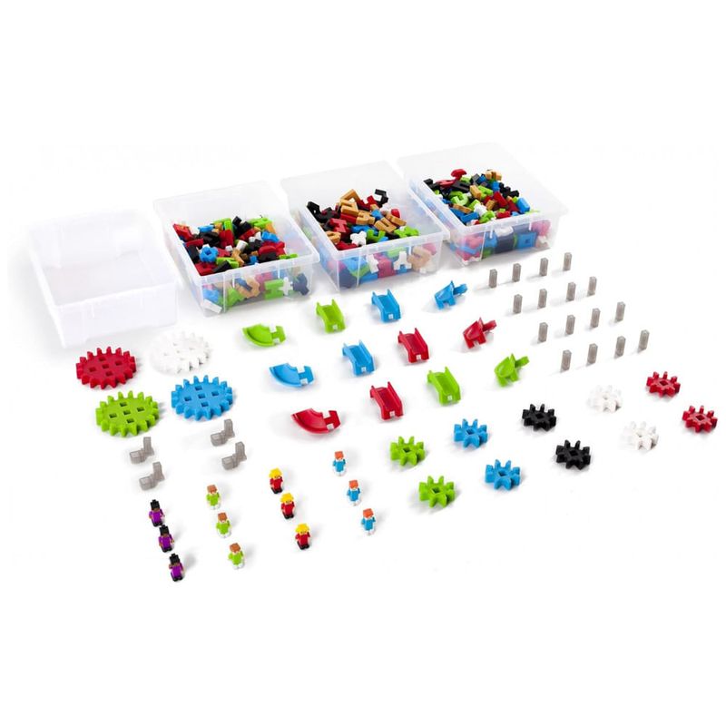 O kit inclui 400 blocos IO Blocks com encaixe por fricção, além de engrenagens, eixos, manivelas, peças de escorregador e figuras IO People que se combinam aos blocos para criar modelos com movimento e estruturas em grande escala. As propostas de uso contemplam exploração de conceitos de STEM, resolução de problemas, máquinas simples, simetria e assimetria, trabalho em equipe e brincadeiras dramáticas em escala de mesa.?