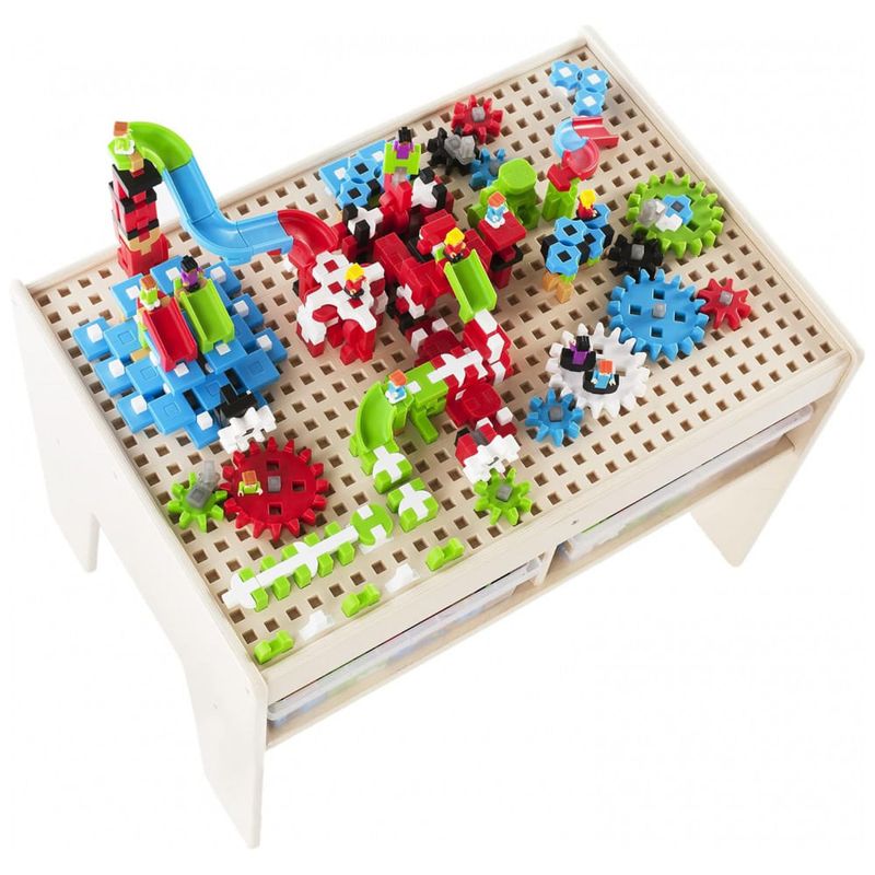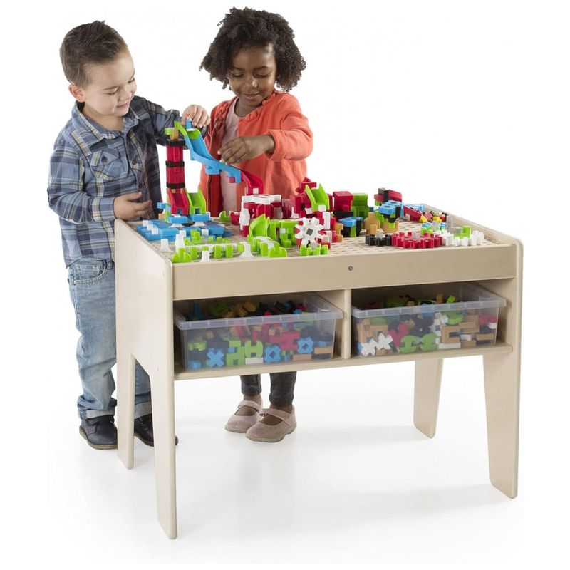 O Guidecraft IO Blocks Center é um sistema completo de construção para educação infantil que integra mesa de atividades em madeira de bétula, quatro bins de armazenamento e um conjunto de 458 peças de montagem. A mesa baixa em madeira multilaminada de bétula possui tampo amplo para montagem, prateleira inferior e estrutura dimensionada para uso por crianças em idade pré-escolar.?
