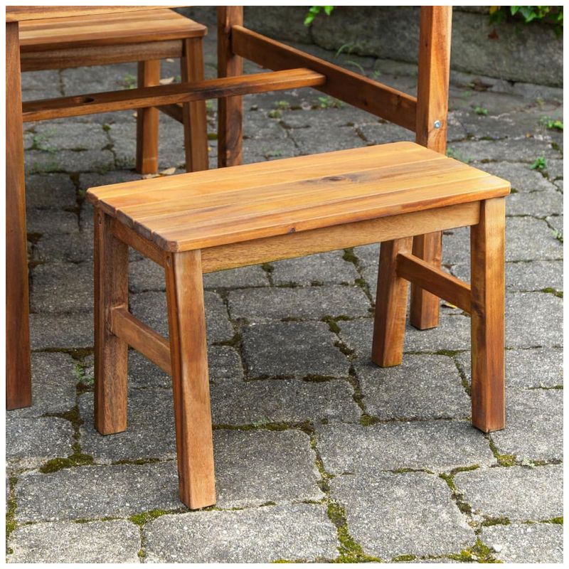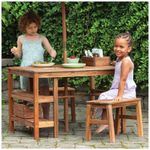 A estrutura da mesa e dos bancos é fabricada em madeira maciça de acácia, material naturalmente resistente a intempéries, projetado para suportar exposição ao sol, à umidade e ao uso frequente, mantendo estabilidade e aparência dentro dos cuidados de manutenção recomendados. Os bancos proporcionam assentos em dimensões infantis, com altura adequada para atividades em grupo ao redor da mesa, e podem ser recolhidos sob o tampo quando não estão em uso, otimizando o espaço disponível.