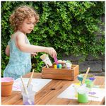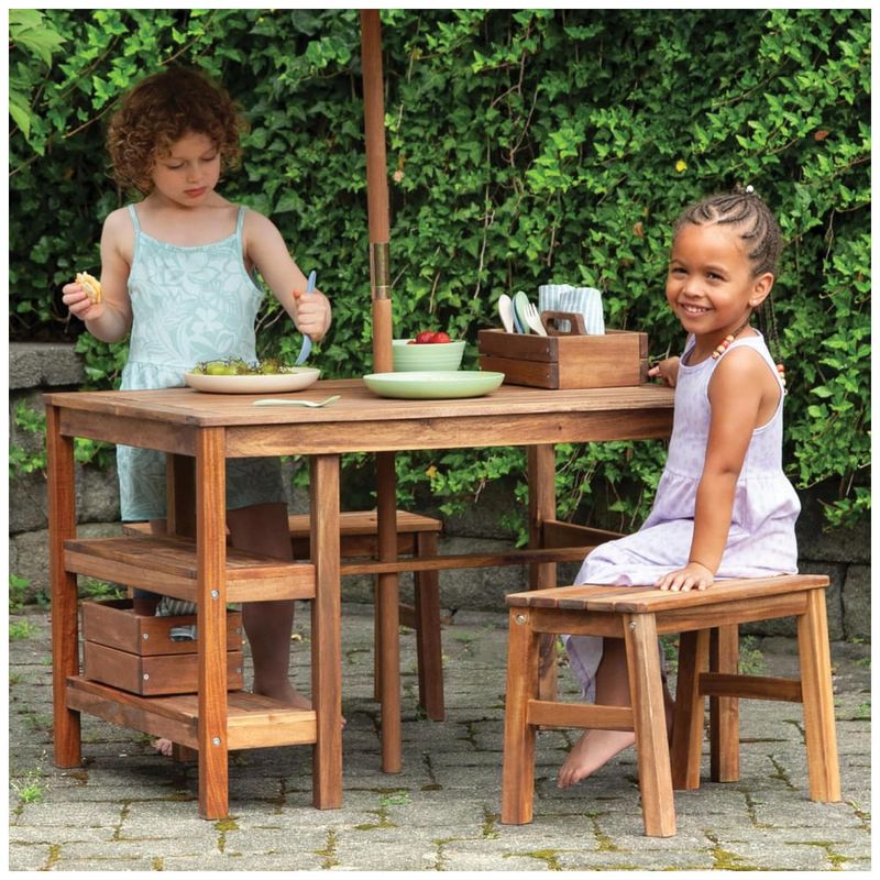 Conjunto infantil para área externa composto por mesa de atividades em madeira, dois bancos coordenados, guarda-sol, caddy divisor e caixa aberta para armazenamento, desenvolvido para criar um espaço colaborativo de brincadeiras, artes e aprendizagem em quintais, pátios, jardins e ambientes externos educativos. A mesa oferece tampo retangular amplo e prateleiras inferiores integradas, permitindo organizar materiais de desenho, pintura, jogos e outros recursos didáticos de forma acessível às crianças.