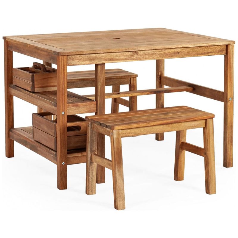 Recursos adicionais: Prateleiras inferiores integradas, bancos que deslizam sob a mesa, guarda-sol com encaixe em furo central e suporte inferior, peças de armazenamento portáteis com alças